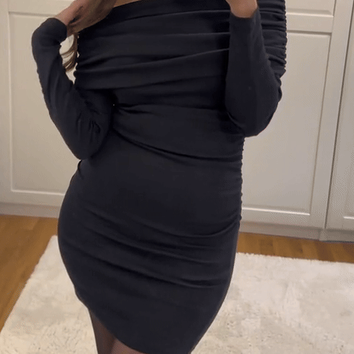 Make an effortless bold statement with our Off Shoulder Gathered Mini Dress, giving you a chic and sophisticated look wherever you go.